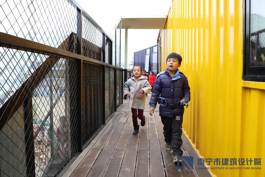 項目采用了集裝箱房屋的形式,由10個集裝箱構成,通過堆積木的形式,根據(jù)學生兒童所需的建筑風格和功能需求,將集裝箱橫豎排列,形成一定的退臺和露臺空間,為孩子們提供更多共享活動空間。