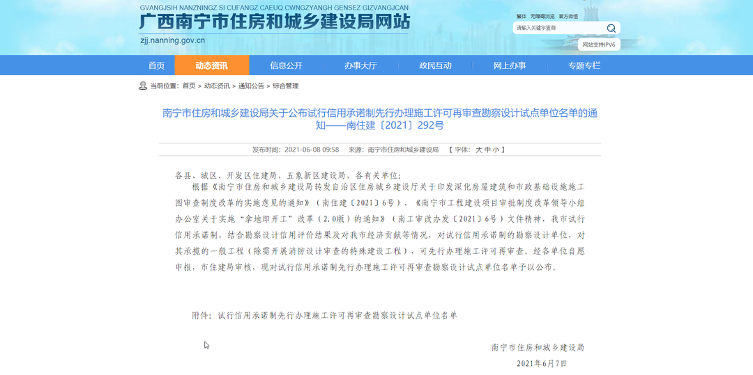 6月8日,南寧市住房和城鄉(xiāng)建設(shè)局發(fā)布《關(guān)于公布試行信用承諾制先行辦理施工許可再審查勘察設(shè)計(jì)試點(diǎn)單位名單的通知》(南住建〔2021〕292號(hào))。