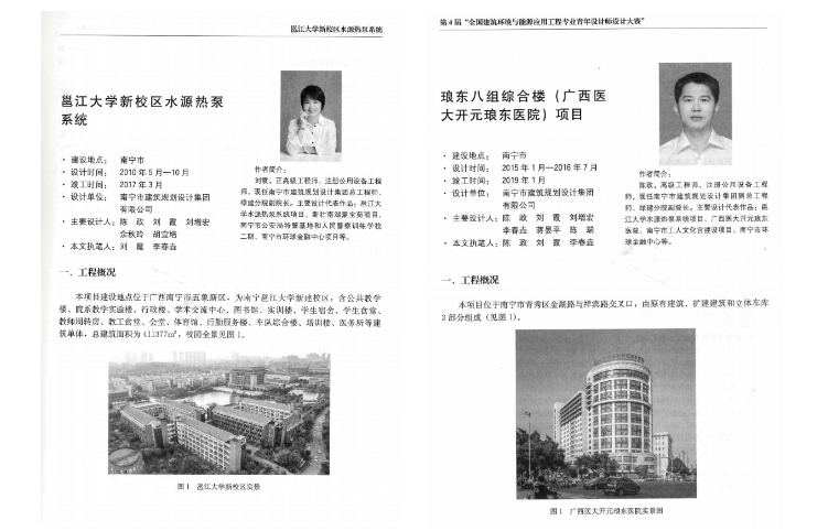 其中,集團(tuán)綠色建筑設(shè)計研究分院李春垚入選第2批中國勘察設(shè)計協(xié)會建筑環(huán)境與能源應(yīng)用專業(yè)青年人才庫人員名單。集團(tuán)設(shè)計項目“邕江大學(xué)新校區(qū)水源熱泵系統(tǒng)”和“瑯東八組綜合樓(廣西醫(yī)大開元瑯東醫(yī)院)”獲《全國勘察設(shè)計建筑環(huán)境與能源應(yīng)用工程專業(yè)優(yōu)秀工程3》收錄并出版發(fā)行。